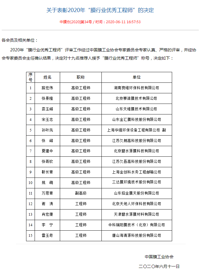 2020年“膜行業(yè)優(yōu)秀工程師”評審工作經(jīng)過中國膜工業(yè)協(xié)會專家委員會專家認真、嚴格的評審,并經(jīng)協(xié)會專家委員會主任確認結(jié)果,對包括我公司董事長宋玉志先生在內(nèi)的十余名推薦人授予“膜行業(yè)優(yōu)秀工程師”稱號。